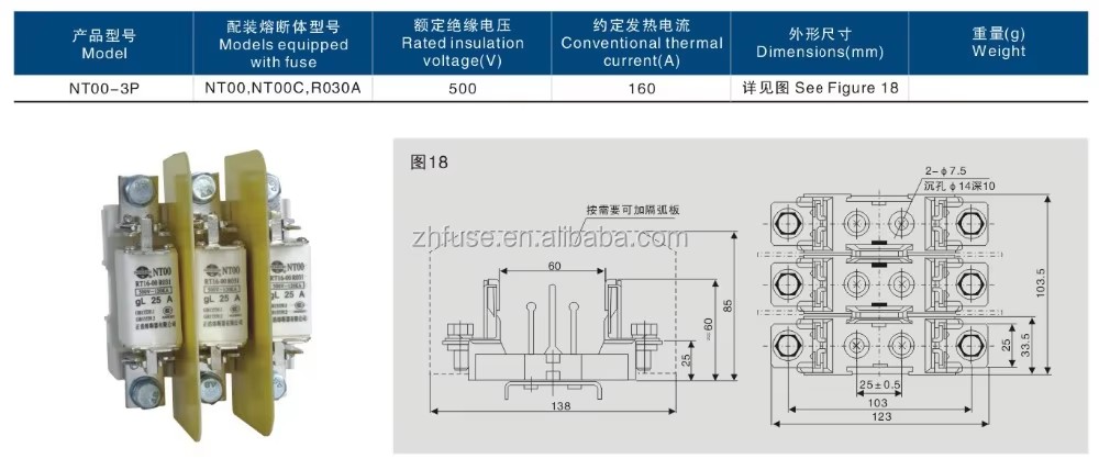 Esta série de fusíveis consiste em um link de fusível e um suporte de fusível. A base de fusíveis NT00-3P é feita de piso de cerâmica de alta resistência ou piso de resina de alta temperatura, com contatos estáticos compostos em forma de cunha. É uma estrutura aberta com boa dissipação de calor, alta resistência mecânica, conexão confiável e operação fácil. A base de fusíveis NT00-3P é compatível com esta série, e o extrator de fusível NH é usado para remover o fusível da base. O link do fusível feito de folha de cobre ou prata puro (ou fio prateado) é selado em um tubo de fusão feito de cerâmica de alta resistência.