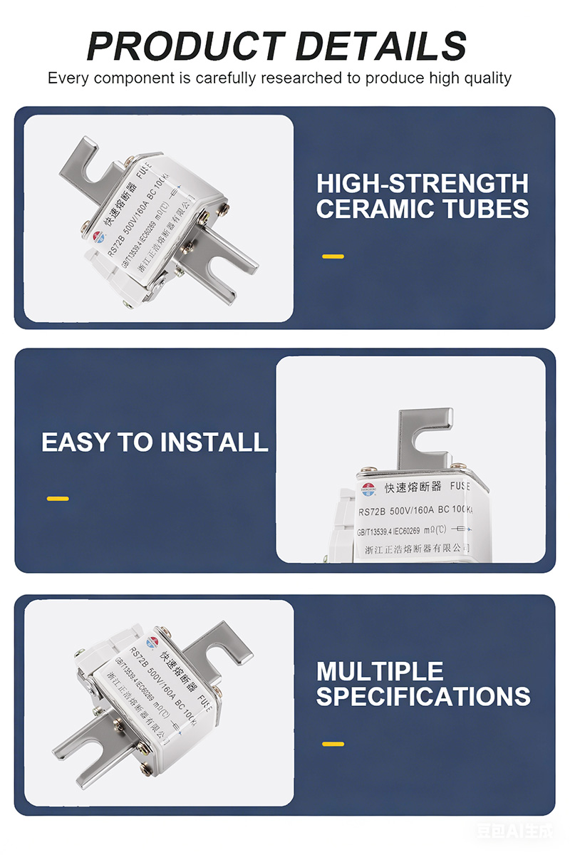 Este produto é adequado para aplicações como sistemas de energia, armários de distribuição, transformadores, etc., garantindo a operação segura dos circuitos. Os elos fusíveis RS72B 500V 160A BC 100KA possuem características de resposta rápida e podem cortar rapidamente a corrente em caso de falha, protegendo o equipamento downstream. Sua tensão nominal é de 500V e a corrente nominal é de 160A, o que atende aos padrões internacionais. Fácil de instalar e manter, adequado para diversas aplicações industriais. RS72B 500V 160A BC 100KA Fuse Links ganhou reconhecimento de vários usuários por seu desempenho estável e confiável, tornando-o uma escolha ideal para garantir a segurança de sistemas de energia.