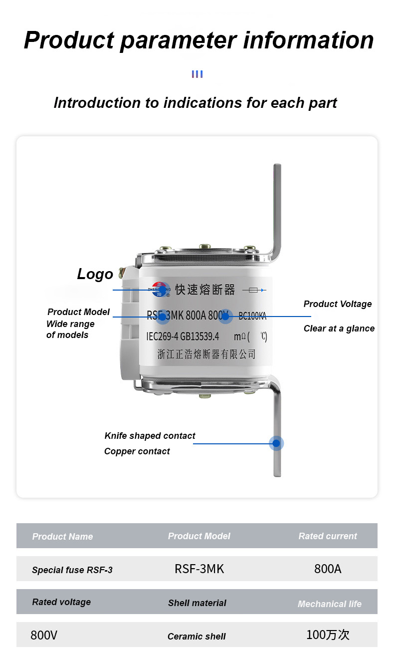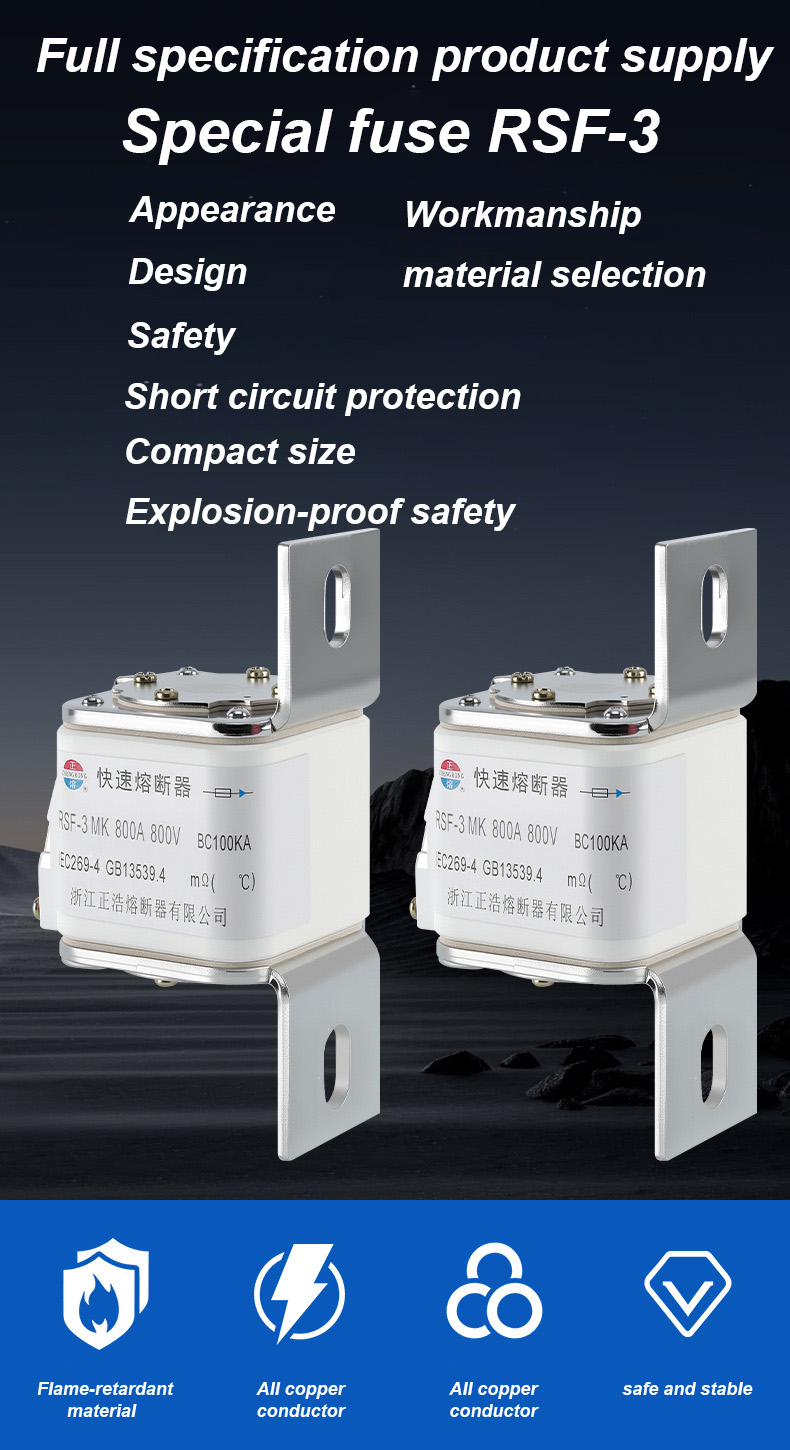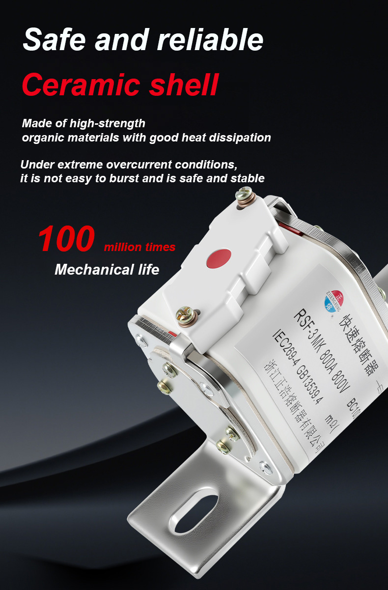 tem uma tensão nominal de 500 V e uma corrente nominal de 315 A, o que pode efetivamente garantir a segurança elétrica, evitar sobrecarga e curto-circuito. Os links de fusíveis RSF-3MK 800V-800A BC100KA